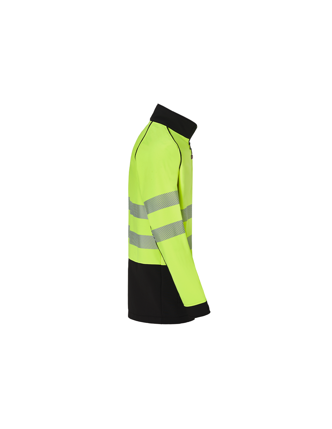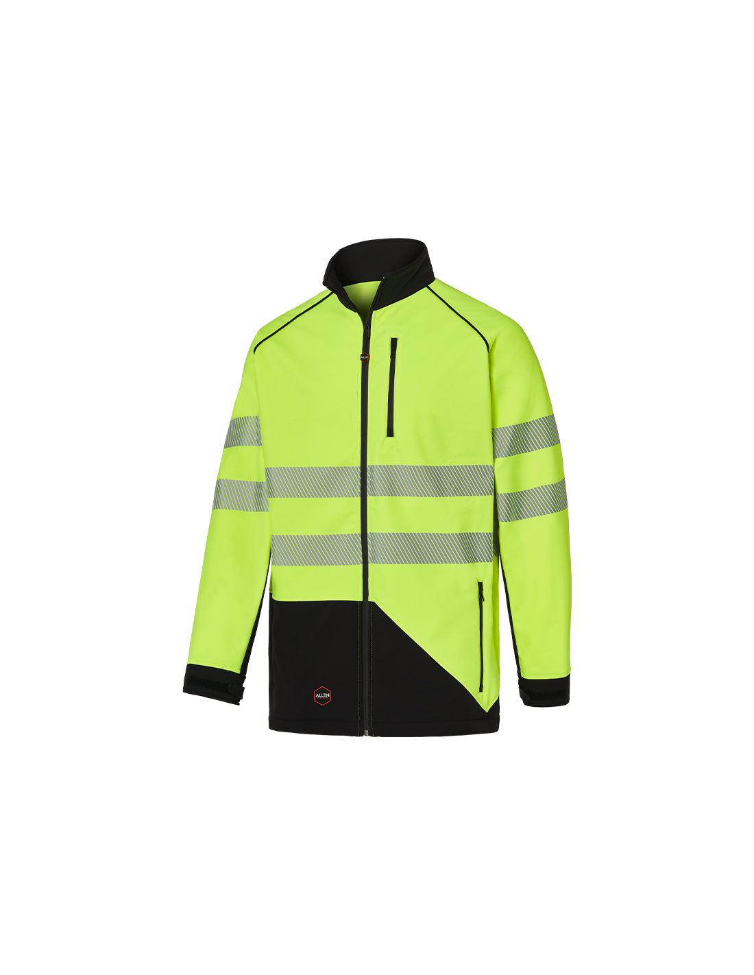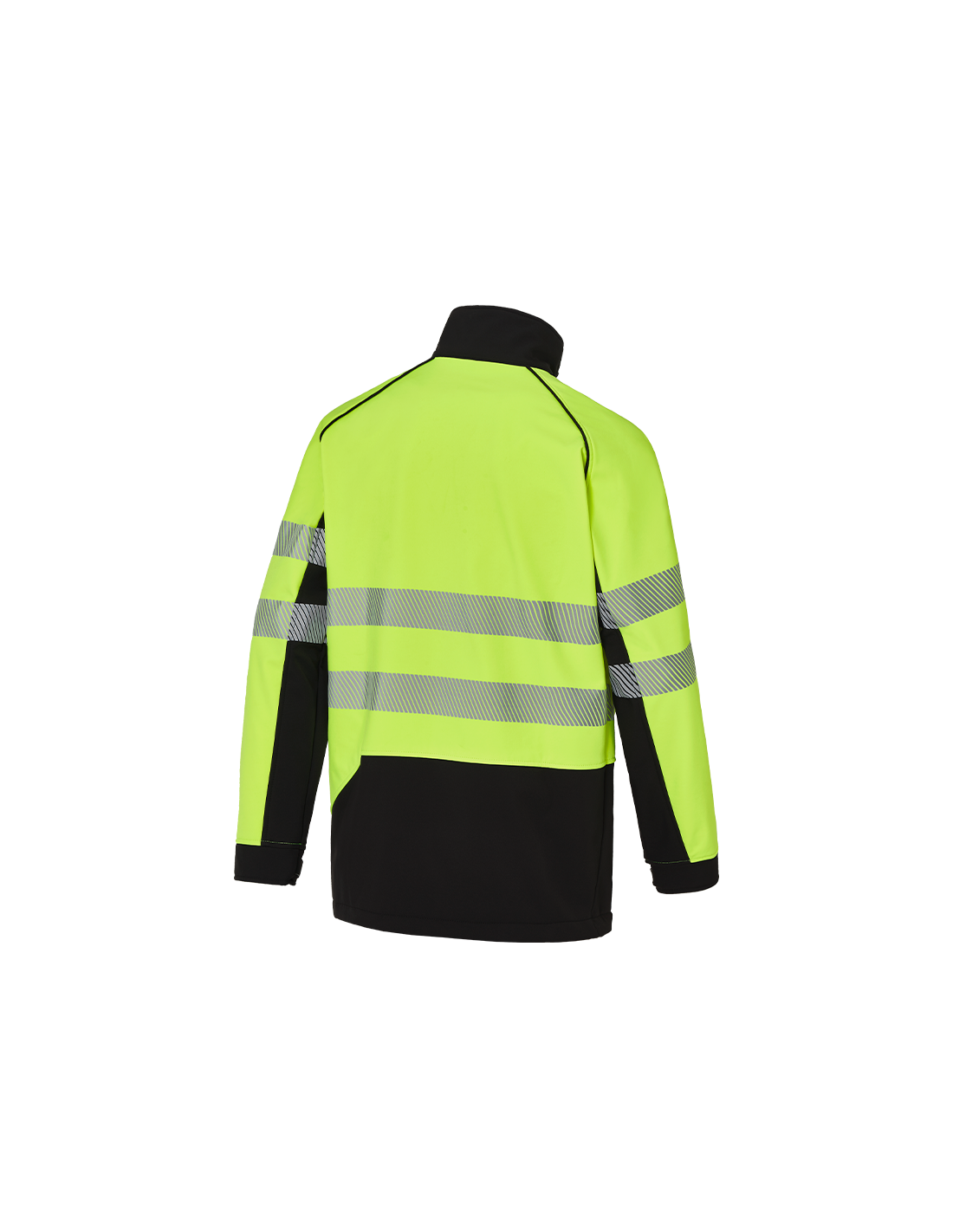 Esta chaqueta softshell de alta visibilidad está diseñada para ofrecer protección, confort térmico y visibilidad avanzada en entornos de trabajo exigentes. Su construcción de tres capas técnicas (300 g/m²) combina un tejido laminado exterior, membrana intermedia y forro polar interior, proporcionando aislamiento, resistencia al viento y una excelente transpirabilidad.