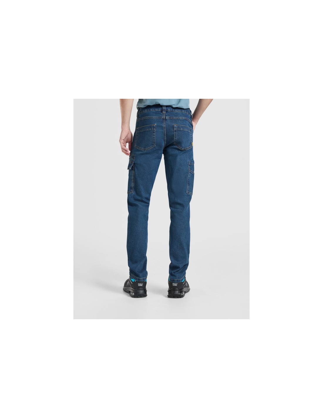 Pantalón largo vaquero multibolsillos con costuras laterales ligeramente adelantadas. Tejido resistente y stretch. Cinturilla con trabillas. Dos bolsillos frontales a la cadera con bolsillo monedero en el derecho. Dos bolsillos traseros. Un bolsillo cargo con tapeta y cierre de velcro en pierna derecha. Un bolsillo integrado con cremallera sobre el cargo. Un bolsillo alargado multiusos en pierna izquierda. Etiquetado Roly WRK exterior.